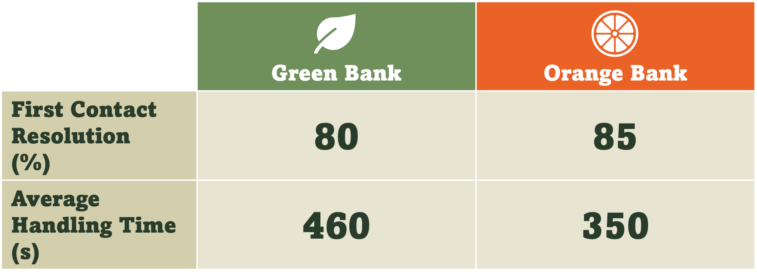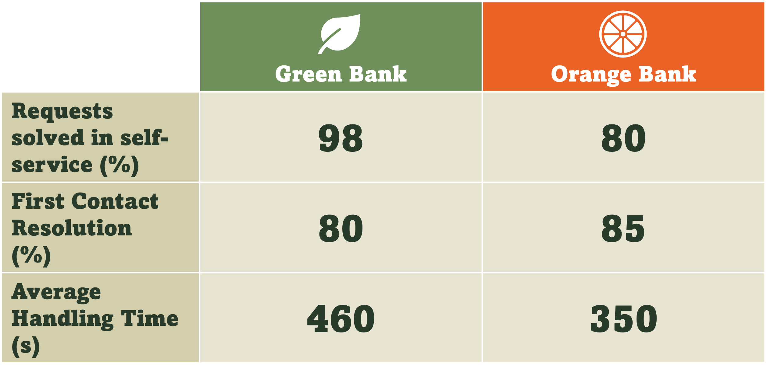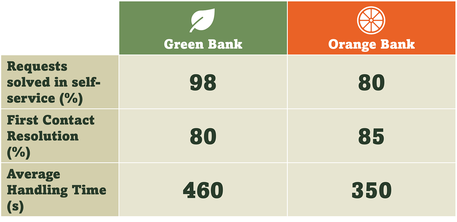 We can now see that for Green Bank, almost all (98%) of customer needs are successfully resolved through self-service, whereas for Orange Bank only 80% are handled in self-service. This implies that a much smaller volume of contacts are being handled by Green Bank’s contact centre. Proportionally, these contacts are more likely to be complex requests, so it’s understandable that they would take longer to handle, and would be harder to resolve in the first contact.