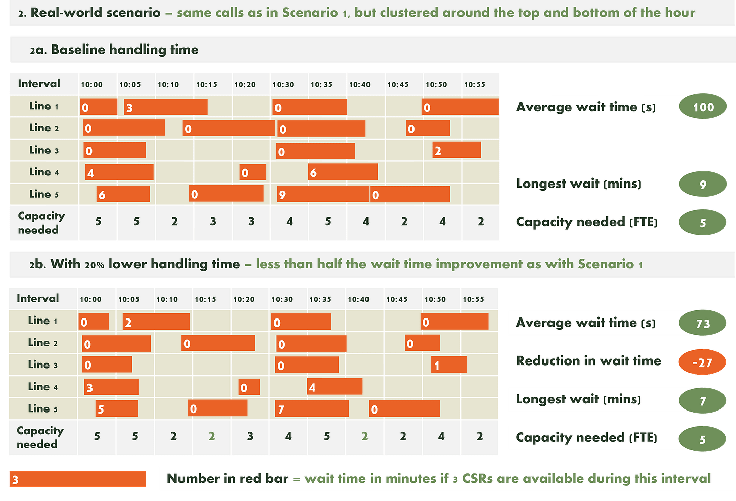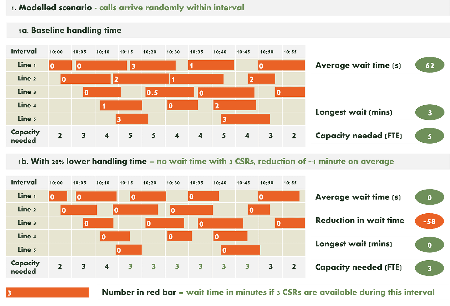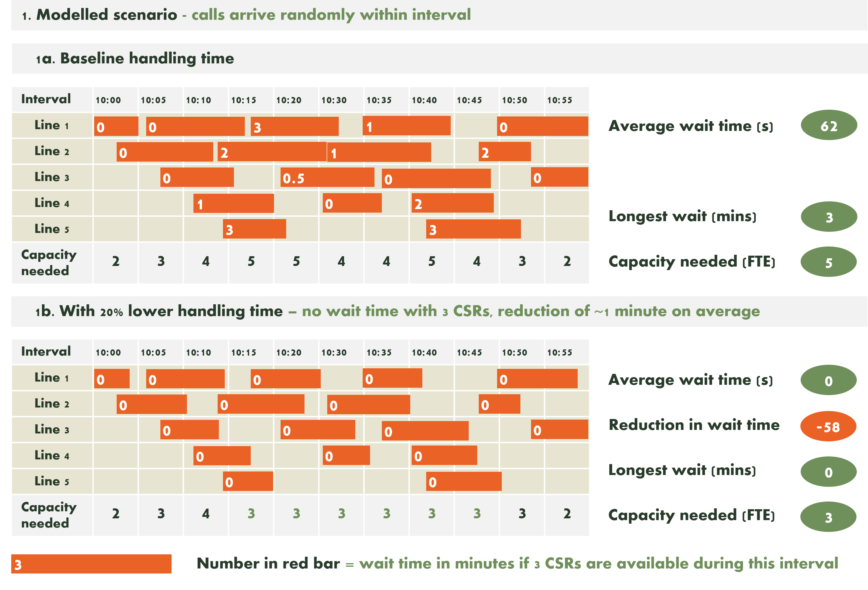 The industry-accepted way of modelling contact centre service levels is to use the Erlang C equation. This model assumes that new calls are added to the queue according to a Poisson distribution. Other articles are much better at explaining the maths than I could manage, but in simple terms, the model assumes that calls arrive randomly within a given interval. If calls do arrive randomly, then a reduction in AHT does generally correlate with shorter queue times, as Customer Service Reps get freed up earlier to take more calls (see Scenario 1 below).